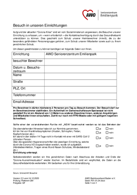 Hier finden Sie das Formular zur Kontaktverfolgung im pdf Format zum Download. Wenn Sie möchten, dürfen Sie das Formular schon zuhause ausfüllen, um einen eventuellen Stau zu vermeiden und keine Zeit zu verlieren.
